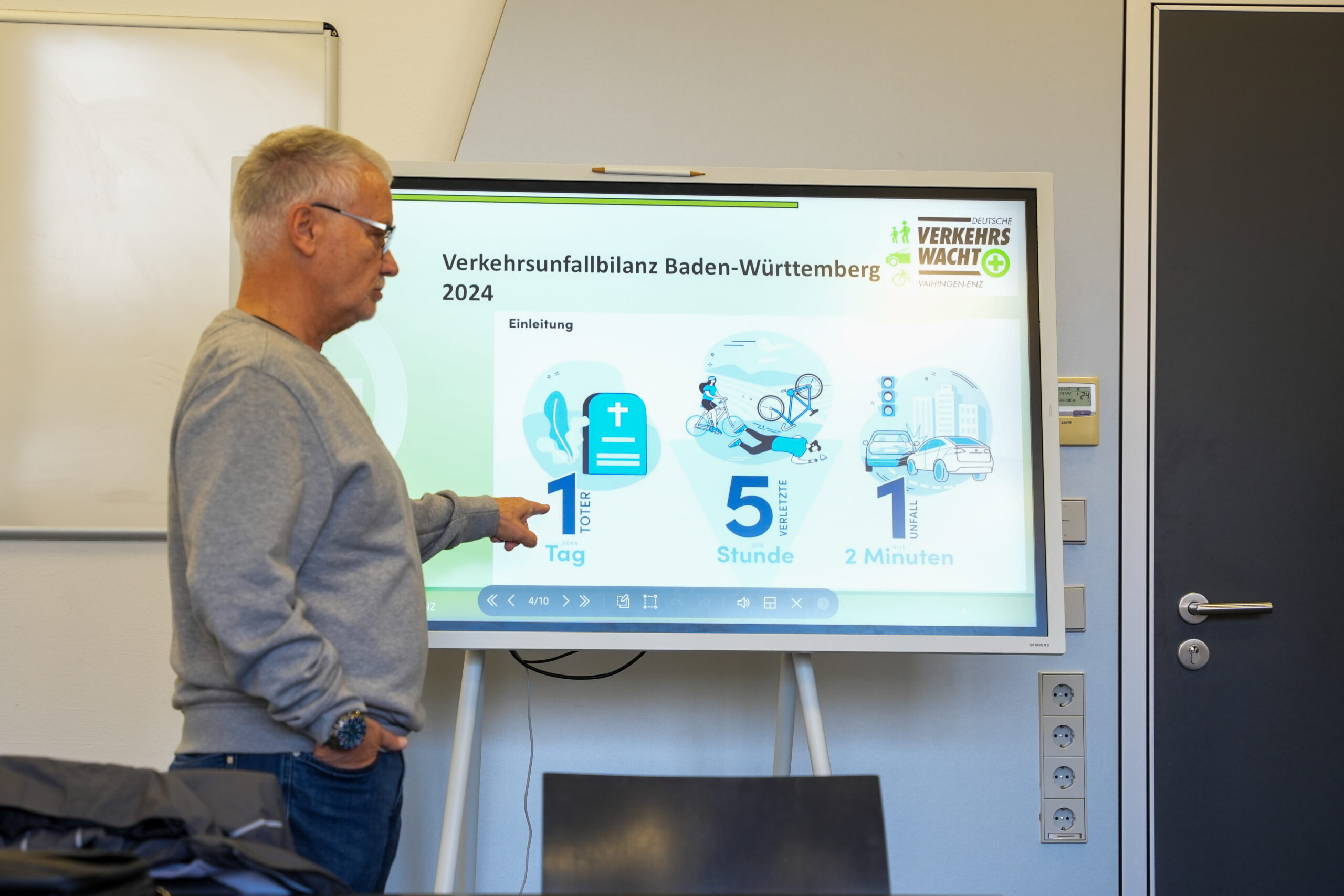 Saugaus eismo centre „Verkehrswacht Vaihingen“ instruktorius Jochenas Wengas praktiškai pademonstravo, kaip vos 10 km/val. greičio viršijimas smarkiai pailgina stabdymo kelią ir gali tapti lemiamu veiksniu pėstiesiems.